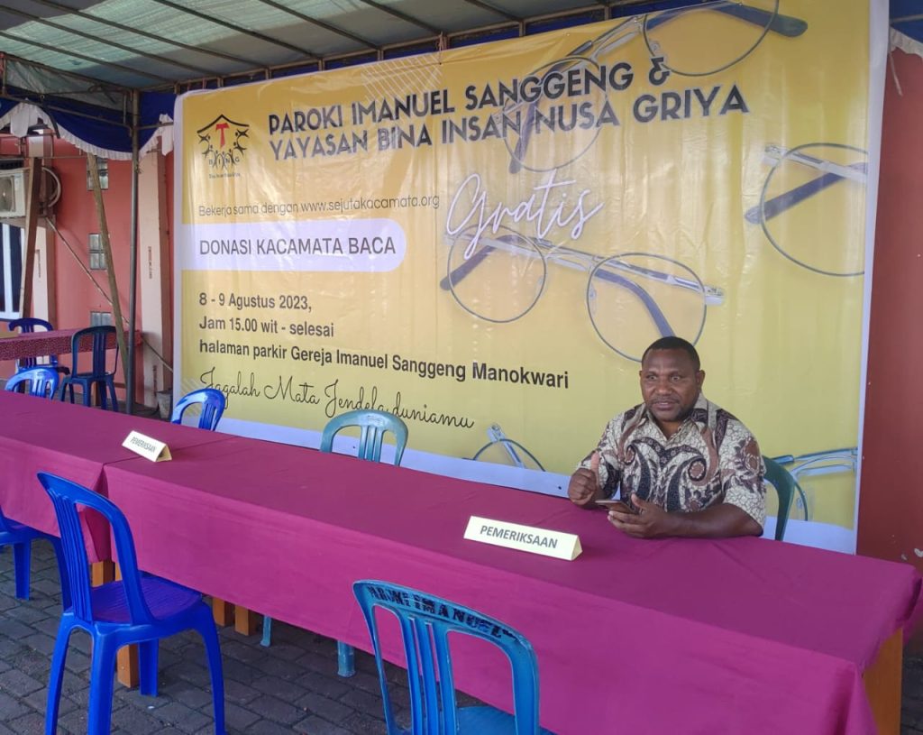 Kami Yayasan Bina Insan Nusa Griya bekerjsama dengan Sejuta kacamata membagikan kacamata baca gratis kepada 390 lebih umat katolik se-Manokwari dan juga masyarakat umum.Penyerahan donasi kacamata baca dilakukan oleh Tim Relawan Sosial Paroki Imanuel pada Selasa 8 Agustus 2023, Pkl 15:00 – 19:00 di halaman parkir gereja Imanuel Sanggeng Manokwari Papua Barat